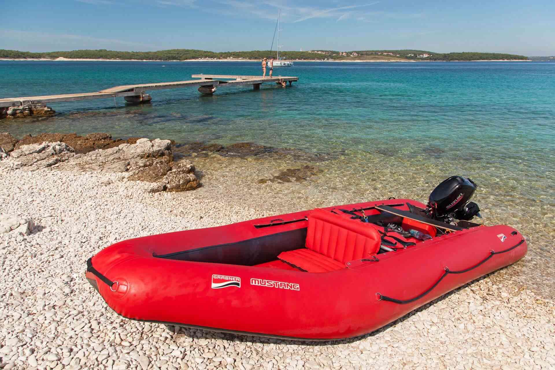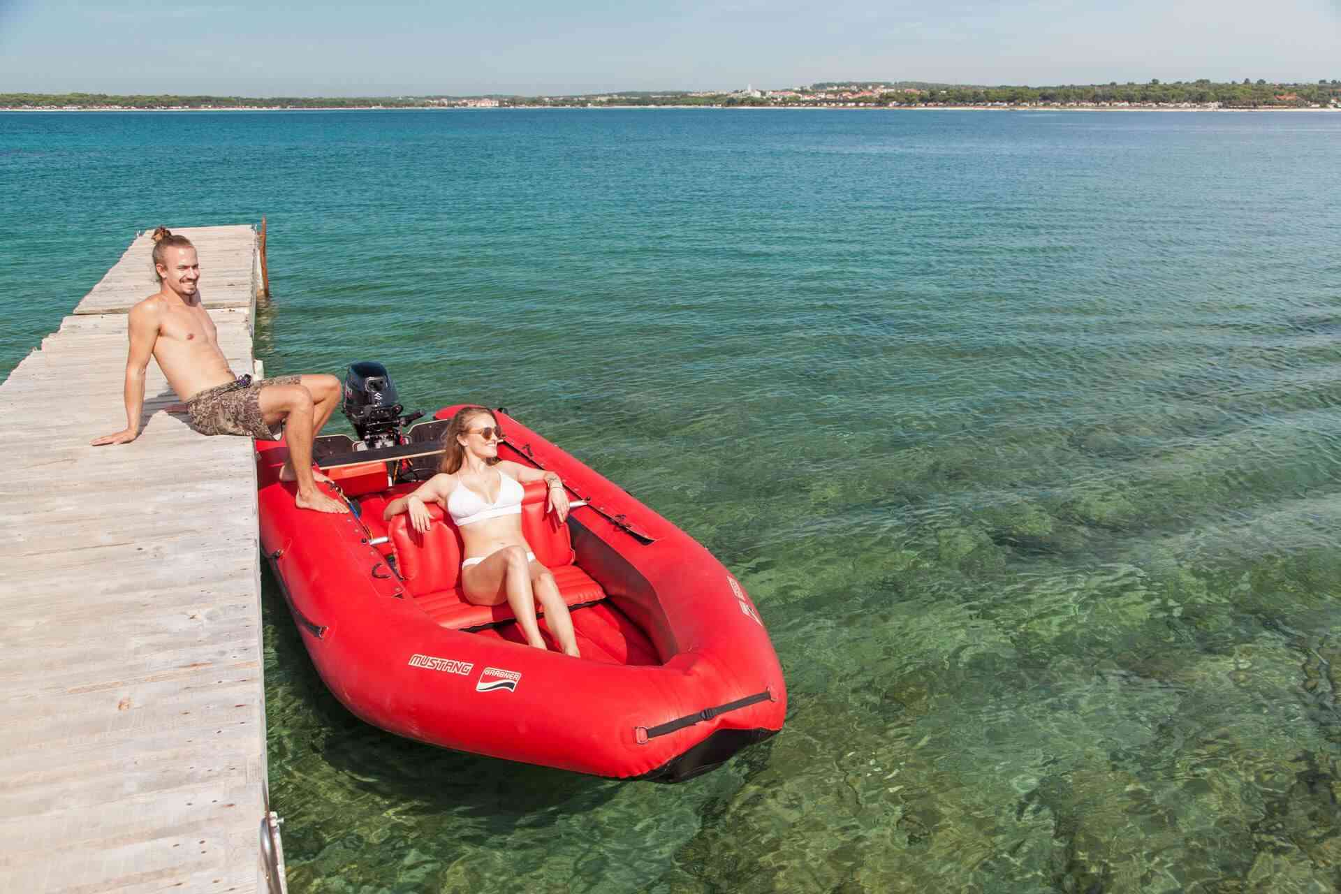 The grommet rail that runs the length of each side of the Mustang GT offers some splash protection as well as infinite possibilities for gear fastening and accessory attachment. Some possibilities include ability to attach a bimini or oarlocks (the Mustang GT is very pleasurable and fast to row). The rope that runs in the grommet rail is well suited as a safety line in rough seas as well as a hand-hold for carrying the boat on land.