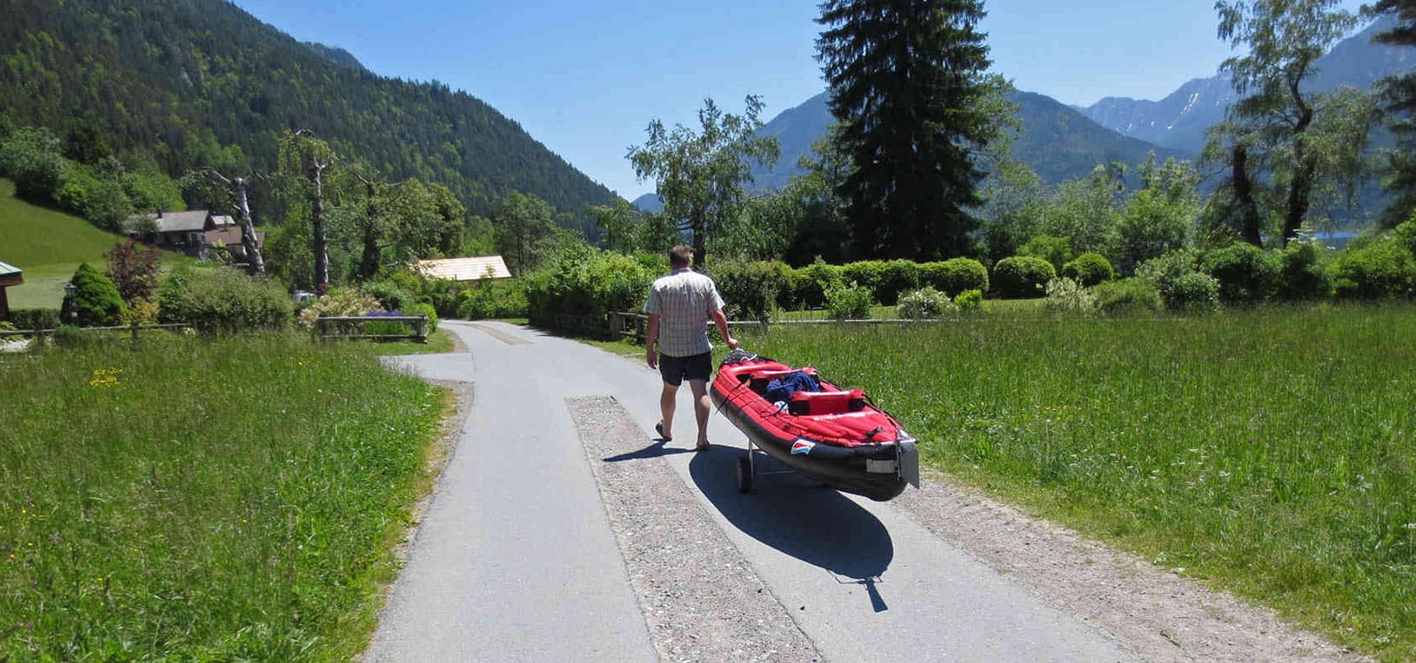 Lightweight dolly for transporting fully inflated kayaks on land. Can be collapsed and taken with you for portages along the way.